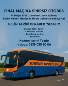 Bu gece Manisa’ya sınırsız sayıda otobüsler kaldırılıyor final maçına gitmek için, katılımlar şimdiden artıyor. Meterisliler taraftar Grubu Mustafa Şekerli ve ekibiyle hemen organize oldular. Bütün Nevşehir bu sevince coşkuya ortak olmak için harekete geçti… Biliyorum ki Ürgüp’ten Taraftar gurubu da hazırlık içindedir. Nevşehir Merkez, Avanos, Acıgöl,Derinkuyu, Hacıbektaş, Gülşehir, Kozaklı, Ürgüp ve Çevre İl ve ilçelerden yoğun katılım olacağına inanıyorum, İstanbul’da bulunan hemşehrilerimiz de bu coşkuya ortak olacaklardır…