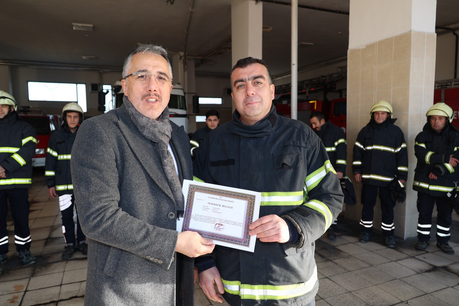 Ziyarette Antalya Gündoğmuş Kaymakamı Hamza Özbilgi ve Senir Mahallesi Muhtarı Durmuş Ali Yıldız tarafından yaz aylarında çıkan orman yangınlarının söndürülmesinde görev alan Nevşehir Belediyesi İtfaiye Müdürlüğü personelleri için gönderilen plaket ve teşekkür belgelerini personele teslim eden Başkan Savran, itfaiye erlerini kutladı.