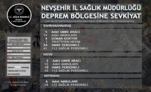 Nevşehir Sağlık Müdürlüğü tarafından yapılan açıklama şu şekilde; “6 Şubat 2023 tarihinde Kahramanmaraş Merkezli Yaşanan Deprem Sebebiyle ilimizden Karayolu ile Araç ve Personel sevki yapılmıştır.