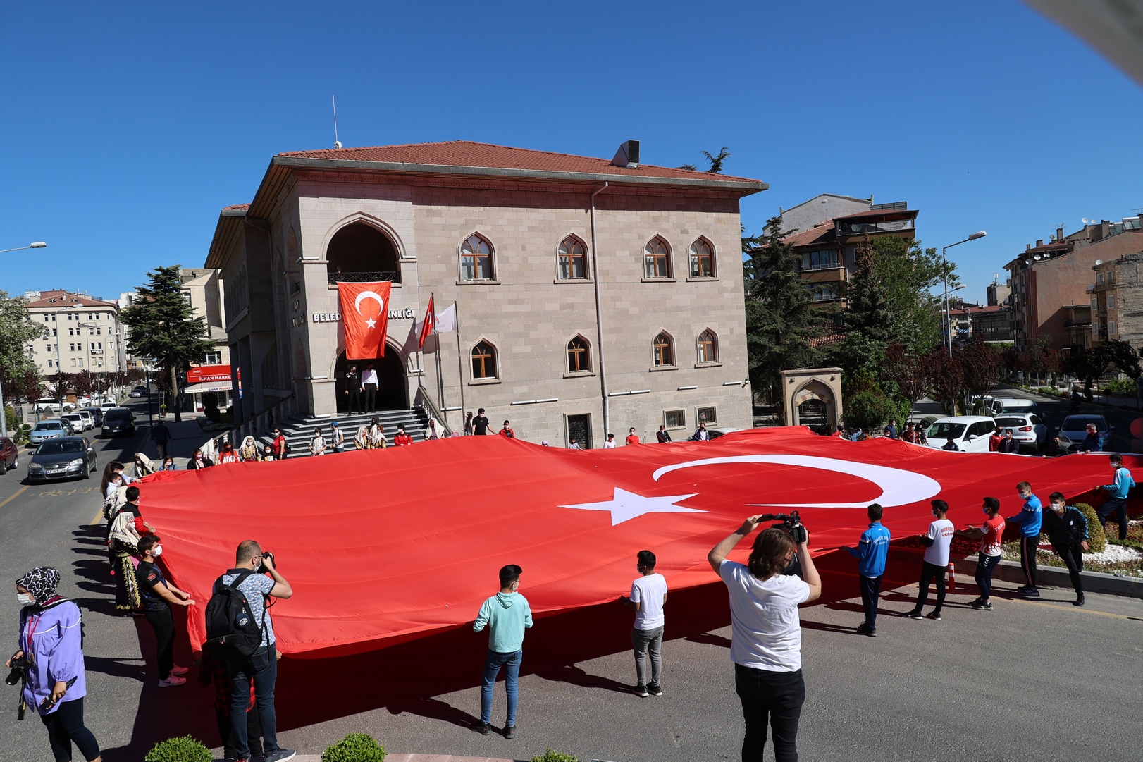 Nevşehir Belediyesi tarafından düzenlenen Gençlik Yürüyüşü’nde, dev Türk bayrağı Atatürk’ün Samsun’a çıkışının 102’nci yılı dolayısıyla 102 genç tarafından Damat İbrahim Meydanı’ndaki belediye binasından Nevşehir Kalesi’ne kadar ellerde taşındı.