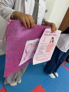 Meme kanserinde erken tanının hayat kurtarıcı rolüne dikkat çekmeyi amaçlayan etkinlikte, Hemşirelik Fakültesi öğrencileri tarafından kursiyerlere meme kanseri risk faktörleri, erken belirtiler ve özellikle kendi kendine meme muayenesinin nasıl yapılacağı konularında detaylı bilgiler aktarıldı.