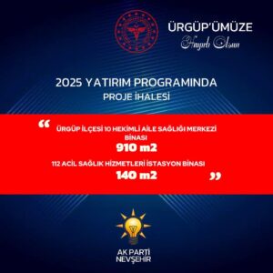 AK Parti Nevşehir İl Başkanı Muhammed Feyzi Aygün, AK Parti Nevşehir Milletvekilleri Emre Çalışkan ve Süleyman Özgün, Nevşehir merkeze 2500 kişilik Spor Salonunun yapım ihalesinin tamamlandığı müjdesini verdi ve Ürgüp ilçesine de 10 hekimli Aile Sağlığı Merkezi ve 112 Acil Sağlık Hizmetleri İstasyon binasının 2025 yılı yatırım programına alındığı müjdesini verdi.