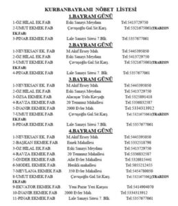 NEVŞEHİR(TRENDHABER)- 4 günlük Kurban Bayramı nedeniyle vatandaşların günlük ekmek ihtiyaçlarını karşılayabilecekleri fırınlar açıklandı.