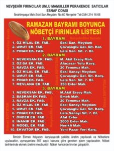 Nevşehir Fırıncılar ve Unlu Mamüller Perakende Satıcılar Esnaf Odası Başkanlığı ,Nevşehir şehir merkezinde Ramazan Bayramının ilk üç gününde ekmek üretimi ve satımını yapacak fırınların listesini yayımladı.