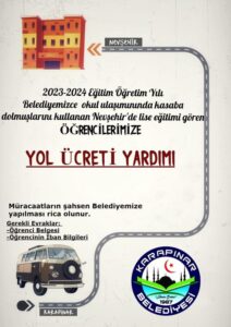 Başkan Yasin Güneş; “Eğitim öğretime desteğimiz devam ediyor. Kasabamızdan Nevşehir’e giden lise öğrencilerine ulaşım için destek oluyoruz. Öğrenci belgesi ve hesap numarası ile Belediyemize müracaat eden öğrencilerimize yol parası desteği vereceğiz. Öğrencilerimize ve velilerimize hayırlı olsun.” açıklamasında bulundu