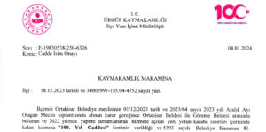 Ortahisar Belediye Başkanı Mustafa AEteş yaptığı açıklamada, Cumhuriyetimizin kuruluşunun 100. Yılının son Ortahisar Belediye Meclisi toplantısında alınan karar doğrultusunda Ortahisar-Göreme arasındaki yolun isminin 100. Yıl Caddesi olarak değiştirilmesinin kararlaştırıldığını belirterek “ Büyük mücadelelerimiz sonucu 2022 yılında yapımı tamamlanarak hizmete giren yeni Ortahisar-Göreme yolumuzun adı; Türkiye Cumhuriyet’imizin 100. Kuruluş yılındaki son Belediye Meclis Toplantımızda almış olduğumuz ortak kararla “100.Yıl Caddesi” olmuştur. Ürgüp Kaymakamlığımızın oluruyla yürürlüğe giren cadde ismimiz, vatanımıza ve milletimize hayırlı uğurlu olsun.” dedi.