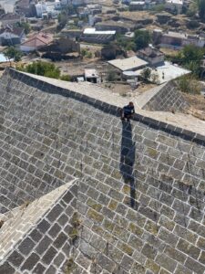 Çalışmalar kapsamında caminin çatı kısmında derzler açılarak bitki temizliği yapıldı.