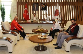 Kapadokya Mavi Umut Gençlik ve Spor Derneği Başkanı Tarkan Güney ve Türkiye Üniversite Sporları Federasyonu İl Temsilcisi Doç. Dr. Özden Taşğın beraberinde Down Sendromlular Atletizm Milli Takımı Sporcusu Ramazan Ünlü ile birlikte NEVÜ Rektörü Prof. Dr. Mazhar Bağlı’yı makamında ziyaret etti.
