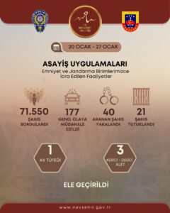 Nevşehir Valiliği, Nevşehir’de 20-27 Ocak 2025 tarihleri arasında Nevşehir Emniyet Müdürlüğü ve İl Jandarma Komutanlığı ekiplerince yapılan denetim çalışmalarının verilerini kamuoyu ile paylaştı.