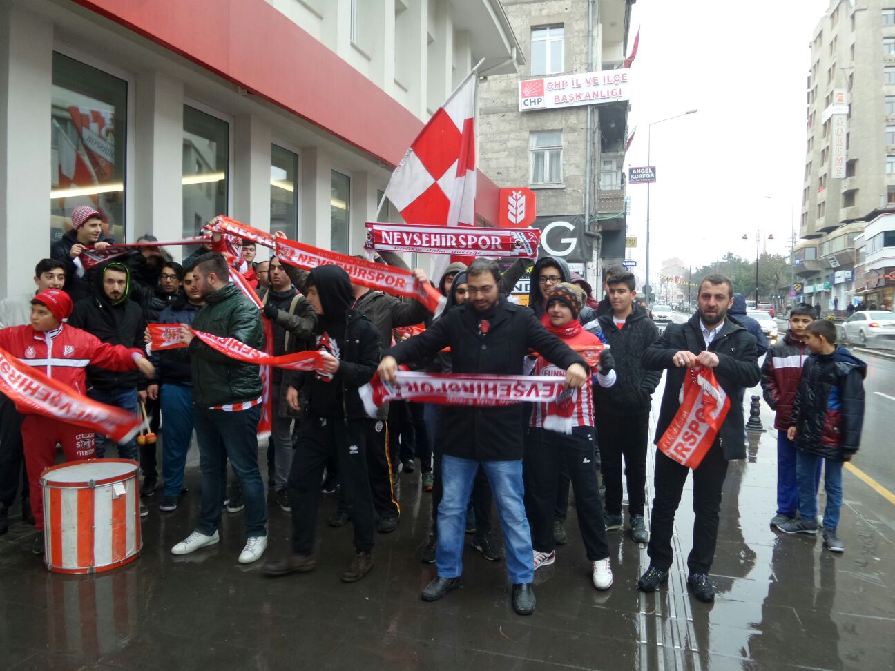 Maçtan önce bir gurup taraftar Ziraat bankası kavşağında bir araya gelerek Nevşehirspor için tempo tuttu meşale yaktı.