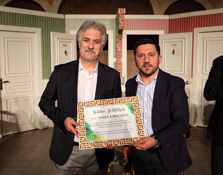 Oyun bitiminde salonu dolduran Nevşehirliler ile birlikte uzun süre oyuncuları alkışlayan Belediye Başkanı Rasim Arı, oyunda rol alan sanatçıların her biri için 10’ar tane olmak üzere Nevşehir Belediyesi tarafından Kahveci Dağı eteklerine fidan dikildiğini açıklayan dikilen fidanlar için hazırlanan sertifikaları oyunculara takdim etti.