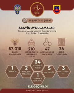 Son 1 haftadan beri yürütülen çalışmalarda 210 olaya müdahale edilirken, 1 tabanca, 2 kurusıkı tabanca, 1 tabanca şarjörü, 5 av tüfeği, 34 av tüfeği fişeği ile 3 kesici ve delici alet de ele geçirildi.