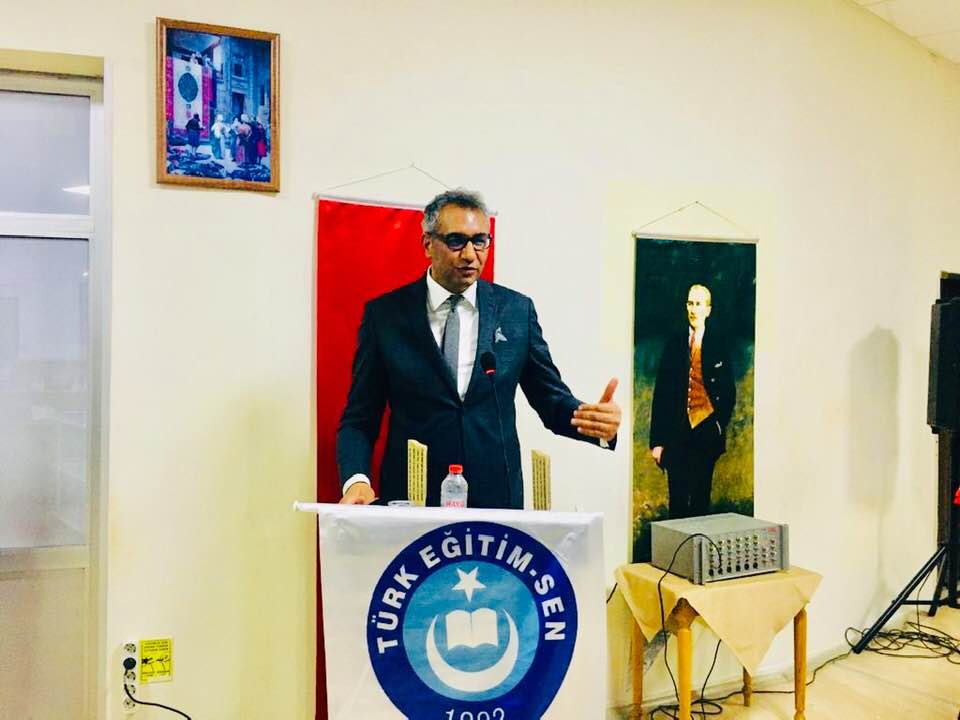 TES Nevşehir  Şube Başkanı Urgenç; konuşmasında Türk Eğitim Sen 1992 yılında kurulmuş bir sendikadır, dünden bugüne Türk Eğitim Sen’in duruşu aynıdır. Millidir, Atatürkçüdür, Haklının yanında mazlumun karşısındadır. Memurun özlük ve mali haklarının geliştirilmesi için bir mücadelenin içindedir. Dün var olanlar bugün yoklar, bugün hormonla büyüyenler de yarın olmayacaklardır. Ancak Türk Eğitim Sen duruşuyla, milli değerlerinden, ahlaki değerlerinden taviz vermeden hak mücadelesi yapmaya devam edecektir. Türk Eğitim Sen’in Diyarbakır başkanı Ahmet Başkan da, Şırnak Başkanı Turgut Başkan da, Mersin Başkanı Ercan Başkan da, Nevşehir Başkanı Tayfur Urgenç te, Genel Başkanı Talip bey’de Ne Mutlu Türküm Diyene! diyerek haykırır. Biz; Diyarbakır’da Megri türküsü çağırip, Şeyh Saide methiyeler düzen, Mersin’de İskilipli Atıf’ı öveceğim diye Atatürk’e hakaret eden, Milli Şehit Kaymakam Kemal bey’in idamını onaylayan, milli mücadeleye karşı çıkan Mustafa Sabri’ye sahip çıkan bir anlayışla mücadele ediyoruz. 10 yıldır her türlü ehliyet ve liyakatı ayaklar altına alan adeta devlet kurumları içinde yuvarlak ve çemberimsi örgüt düzeyine ulaşmış bir çete ile mücadele ediyoruz. Düşüne biliyor musunuz kişilerin özgürce kendi sendikalarını seçemedikleri bir demokrasi hayatımızdadır. Devletin memuru olarak çalışan ve aynı zamanda bir sendikanın il ilçe temsilciliğini yapan şahıslar iş gününde devletin işini, sendika gününde sendikanın işini yapsınlar. Hiç bir güç sonsuz ve müktedir değildir. Dünkü ahlaksızlıkları tarihsel hafızamıza kaydettiğimiz gibi bugün yaşananları da kaydediyoruz. devlet kurumlarını kendi şahsi menfaatleri doğrultusunda kullanarak, çalışanların devlete olan güven duygusunun sarsılmasına neden olan anlayışa dur dememiz gerekmektedir. Bizler rüzgarda bayrağımız dalgalandığında gözyaşlarımıza hakim olamayan bir teşkilatın mensuplarıyız. Anlayışımız Şeyh Edebali’nin İnsanı yaşat ki devlet yaşasın! düsturu üzerine kuruludur. Türkiye Cumhuriyetinin kuruluş felsefesi doğrultusunda Gazi Mustafa Kemal Atatürk’ün gösterdiği aydınlık yarınlara inşallah hep birlikte ulaşacağız. Bunu başaracağız. Türk Eğitim Sen; Atatürkçüdür, milliyetçidir, vatanseverdir, Cumhuriyetçidir, Laiktir, Dindardır, Mütediyen insanlardan oluşmaktadır. Bizler diğerlerini ötekileştiren bir anlayışla sendikacılık yapmıyoruz. Herkesi devleti ebed müddet, devleti ebed adalet anlayışı doğrultusunda bütünleştiriyoruz. Biz hep doğruları söyledik hiç te yanılmadık, zorlu bir mücadelenin içerisinde yılmadan çalışacağız ve başaracağız ahlaklı erdemli bir yaşamı gerçekleştireceğiz. Tüm arkadaşlarımdan istirham ediyorum Yöneticiler yapmıyorsa bile bunu bir görev sorumluluk duygusu içinde yapınız; okullarımızda İstiklal Marşı’nı canlı bir şekilde okutun. Okullarımızın web sitelerinde Atatürk köşelerinin güncel olması konusunda okul yöneticilerini uyarın. Ve inanıyoruz ki aynı fikirleri paylaşan insanlar aynı duygularla birlikte gönül bağlarını güçlendirirler. Var olsun Türk Eğitim Sen! Var olun değerli arkadaşlarım diyerek sözlerini tamamladı.