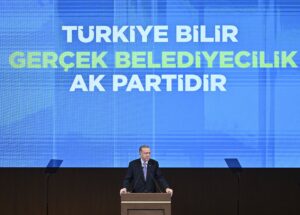 Salondakilere, “31 Mart’ta Türkiye Yüzyılı şehirleri için hazır mıyız, kararlı mıyız? 31 Mart’ta Türkiye Yüzyılı şehirlerimizi gerçek belediyecilikte taçlandırıyor muyuz? Bunun için seçim gününe kadar kapı kapı dolaşmaya var mıyız? Seçim akşamı Türkiye haritasını Cumhur İttifakı’nın renkleriyle boyamaya var mıyız? Seçimi güven ve istikrar ikliminin tesis ve tahkimin vesilesi haline getirmeye var mıyız? Kendimiz ve evlatlarımız için huzurlu, mutlu ve müreffeh bir geleceğin kapılarını beraberce açmaya var mıyız? Büyük ve güçlü Türkiye vizyonumuza sıkı sıkıya sahip çıkmaya var mıyız?” sorularını soran Erdoğan, “evet” yanıtı üzerine “Rabbim hepinizden razı olsun. Sizlerin bu sevgisi, coşkusu, vefası bizimle isimli olduğu müddetçe Allah’ın izniyle kimse hedeflerimize ulaşmamızı engelleyemez.” ifadelerini kullandı.