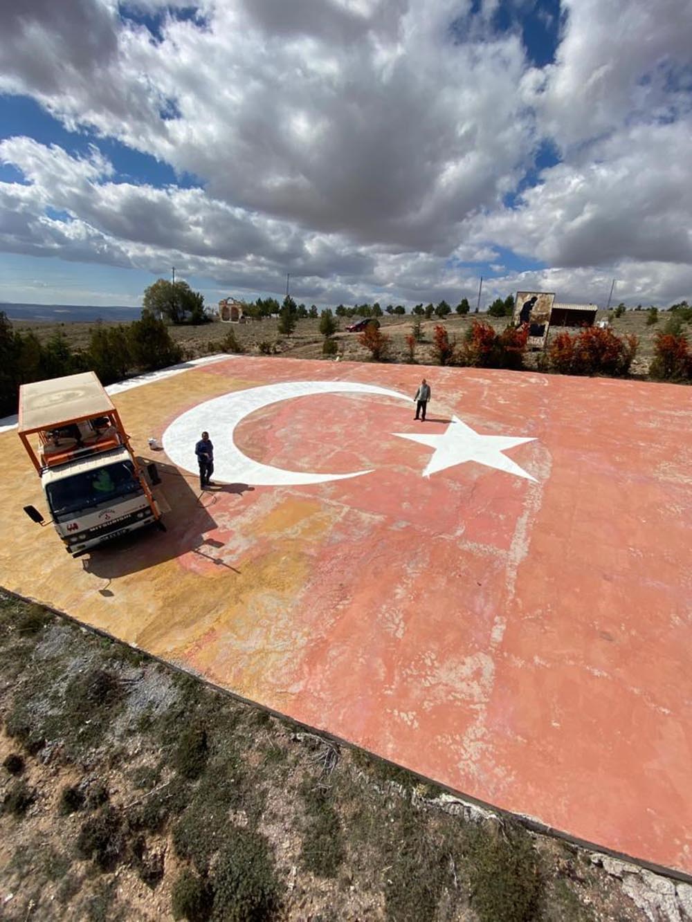 Kamil Duru; “ Sarılar köyündeki Türkiye’nin en büyük beton Türk Bayrağı , Destek Hizmetleri İl Müdürlüğü ekiplerince 750 kilogram beyaz ve 100 kilogram da kırmızı boya kullanılarak ilk günkü haline getirildi.” dedi.