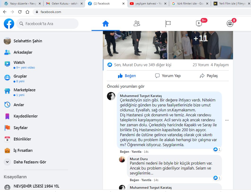 Çerközköylü Muhammed Turgut Karataş isimli bir kardeşimiz, Çerkezköy Kaymakamı Murat Duru’nun  facebook daki hesabı üzerinden Diş Hastanesi ile ilgili bir talebini iletiyor. Sayın Kaymakam vatandaşının sorduğu soruya belki aynı anda olmasa bile cevap verebiliyor.  Bu benim işim mi yahu demeden,vatandaşı  bir kardeşi gibi  görerek cevap verebiliyor.
