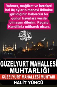 NEVŞEHİR(TRENDHABER)- Güzelyurt Mahallesi Muhtarı Halit Yüncü, bu gece idrak edeceğimiz mübarek Regaib Gecesi münasebetiyle tebrik mesajı yayınladı.