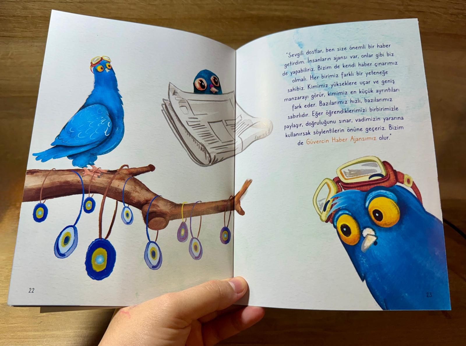 Kitapta, Kapadokya'da yayılan asılsız söylentilerin toplumda yol açtığı kaygı ve güvercin "Mavi"nin hakikati arayışı ele alınıyor. Kitaptan Bilgi: Kapadokya’nın masalsı vadilerinde bir sabah garip söylentiler yayılmaya başlar: “Su bitecekmiş!”, “Yuvalar tehlikedeymiş!” Herkes endişelenirken meraklı güvercin Mavi, duyduklarına hemen inanmak yerine gerçeği öğrenmeye karar verir. Rengârenk balonların arasından geçerek Ankara’ya, insanların “haber çınarı” olan Anadolu Ajansına doğru kanat çırpar. Orada doğru haberin nasıl araştırıldığını keşfeder.