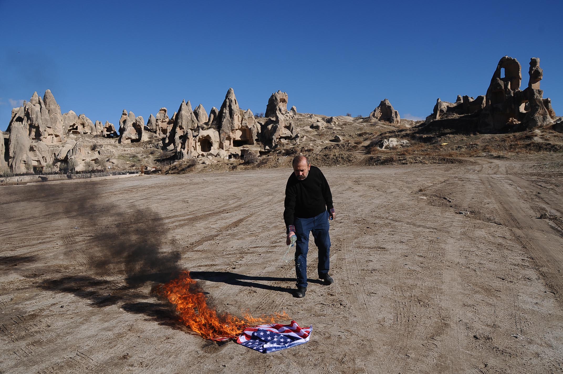 ABD Başkanı Donald Trump, Kudüs’ü İsrail’in resmi başkenti olarak tanıdıklarını açıklamasından sonra Kapadokya’da tepki gösteren Bağkur emeklisi, 61 yaşındaki  İrfan Temur, İsrail ve Amerika bayrağını yakarak tepkisini gösterdi.