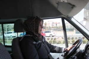 Annesi Müjgan Basır, servis taşıtının hostesliğini yaptığını söyleyen Hülya Özdemir; “ Eşimi3.5 yıl önce trafik kazasında kayıp ettim. Bir oğlumve bir kızım var, onları okula kendim getirerek yola düştüm, sonra yol çok hoşuma gitti benim, videolarda izlediğim bayan otobüs şoförleri ve TIR şoförleri ilgimi çekiyordu. Kendime güvenim vardı, cesaretim vardı, neden servis şoförü olmayayım dedim. bence çocukları en güzel anneler götürürdü, bu niyetle düştük yola,önce ehliyetimi büyüttüm, gerekli belgelerimi tamamladım, sonra da kooperatife başvuru yaptım.Bu yıl başladım, annem ile birlikte çalışıyorum, annem aracımda hostesim, iki okul çalışıyorum, biri devlet okulu bir kolej olarak çalışıyorum,günde 5 kez yollardayım. Bu işe ilk geldiğimde bayan şoför olduğum için çok destekte gördüm, yolda görenler aracıma selam verenler, idolüm oldun diyenler,el sallayanlar , çok destek verenler oldu,şoför ağabeylerimde çok destek oldular.Böyle devam ediyoruz. Ben bu işi çok sevdim, severekde yapıyorum, çocuklarla iletişimimim çok güzel, ailelerle de çok güzel, onlarda bayan şoför olduğum için daha güvenli bulduklarını söylüyorlar. Bu işe aynen devam etmeyi düşünüyorum. Biz servis şoförleri olarak çok sık denetimden geçiyoruz. Bani şoför olarak gördüklerinde çok şaşırıyorlar. SRC’de almışsın diyen ekipten arkadaşlar var, bazıları çok tebrik ediyor, Diyorlar ki ‘Evimizin altı market, hanımlar bir yumurta almaktan aciz’ Bu da insana mutluluk veriyor.” dedi.
