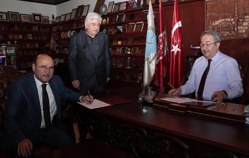 Sosyal Denge Sözleşmesinin imzalanmasının ardından BEM-BİR SEN Genel Başkanı Mürsel Turbay,Belediye Başkanı Hasan Ünver’e Vatan Şairimiz Mehmet Akif Ersoy’un Safahat’ını hediye ederken, Belediye Başkanı Ünver’de Turbay’a Hitit Anforası takdim etti.