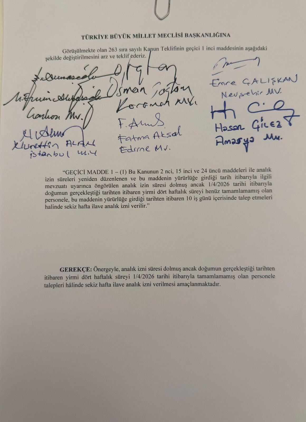 Nevşehir Milletvekili Emre Çalışkan’ın da imzasının bulunduğu önerge ile analık izni süresine ilişkin yeni bir hak tanındı. Yapılan düzenlemeye göre; doğum sonrası analık izni süresi dolmuş ancak 1 Nisan 2026 tarihi itibarıyla 24 haftalık süreyi henüz tamamlamamış olan personellere, talepleri halinde 8 hafta ilave analık izni verilecek.