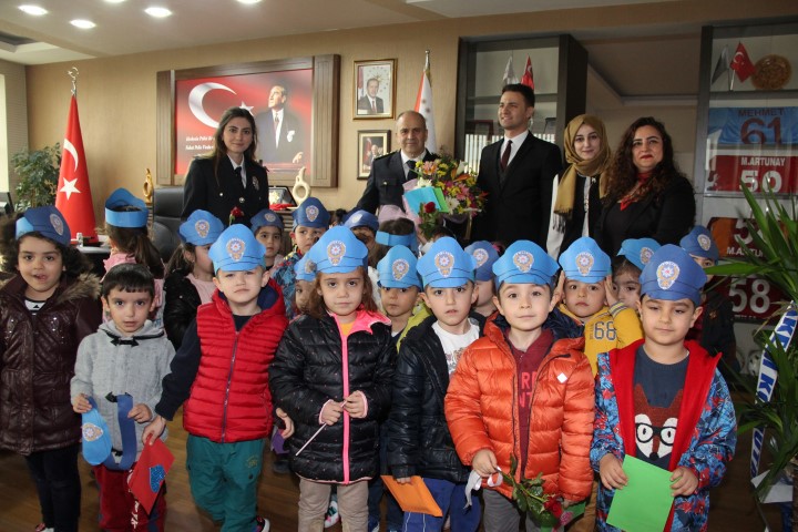 Nevşehir Vilayetler Anaokulu minikleri Türk Polis Teşkilatının Kuruluşunun 173. Yıldönümü nedeniyle Emniyet Müdürü Mehmet Artunay’ı makamında ziyaret ederek yapmış oldukları resimleri hediye etti.
