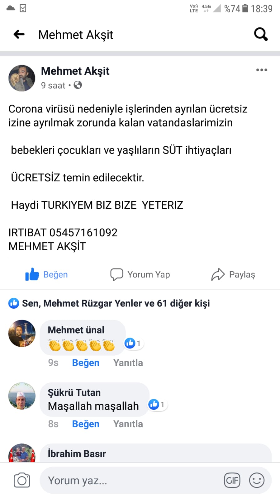 Mehmet Akşit,yaptığı açıklamada “ Uçhisar’da esnaflık yapıyorum ekstradan da süt çiftliğim var. Bu çiftliği 3 yıl önce kurdum. Süt çiftliğini devletten Ben inekleri mi 5 yıl ödemeli devletten aldım. Recep Tayyip Erdoğan Cumhurbaşkanımızın yapmış olduğu destek kampanyasında artık sıranın bize geldiğini düşünerek imkanı olmayan Özel sektör de çalışan durumu olmayan işini kaybetmiş bebeği olan çocuğu olan yaşlısı olan vatandaşlarımıza bir nebze faydamız dokunsun istedik. Kendi imkanlarımızla destek olmaya çalışıyorum. İlk etapta 100 litre süt dağıttığını belirten Akşit,her her gün yükselerek te devam ediyor.Bizim gücümüzün yettiği yere kadar gideceğiz. Cumhurbaşkanımız ne zaman tamam derse o zamana kadar süt dağıtacağım. Korona virüsünün sıkıntısından kurtuluruz ne zaman ülkemiz refaha kavuşur o zamana kadar devam edeceğiz ”dedi.