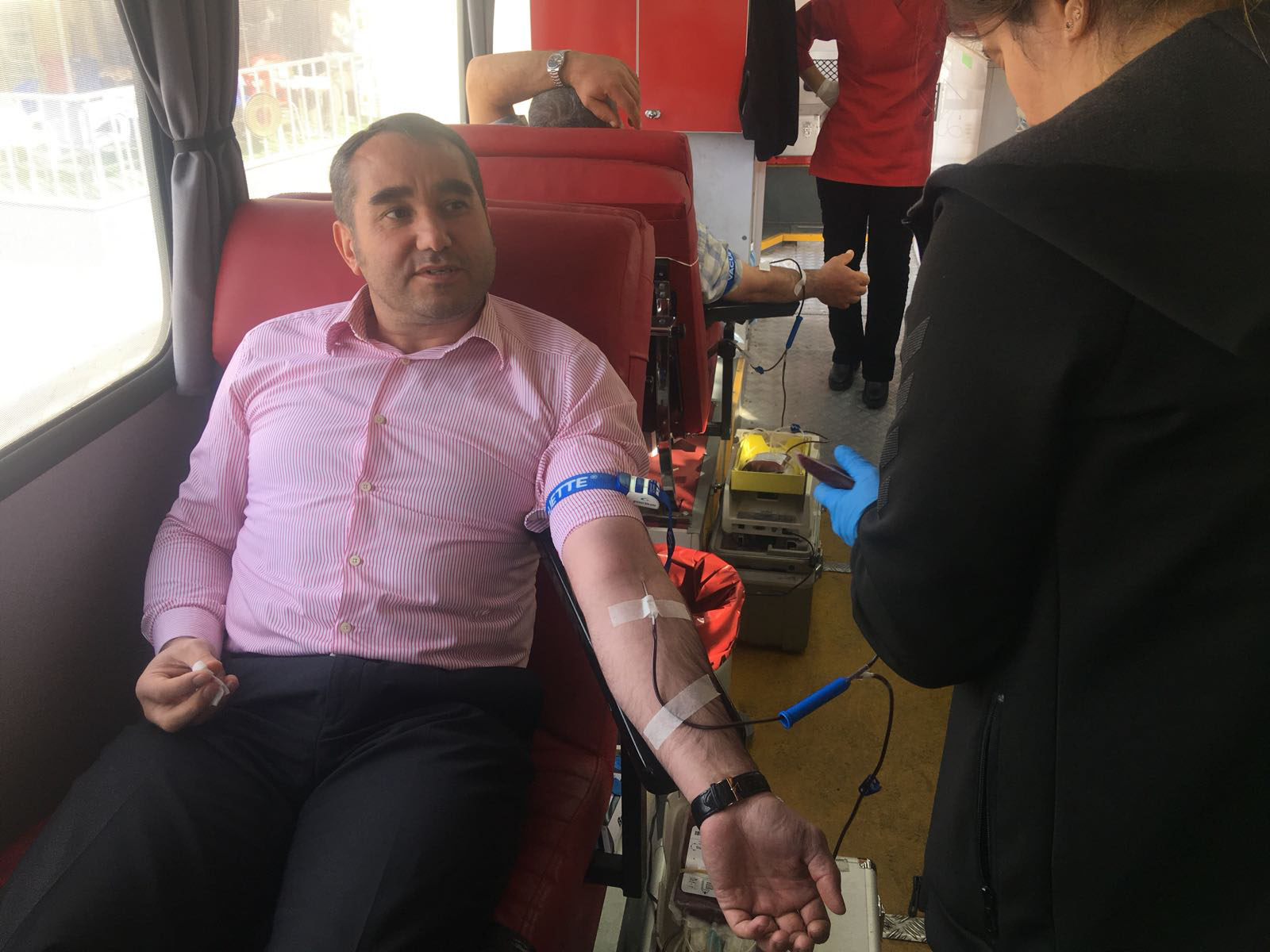 Kızılay’ın kan kampanyasının duyurulması için destek veren Başkan Elma, ziyarette kan verdi.