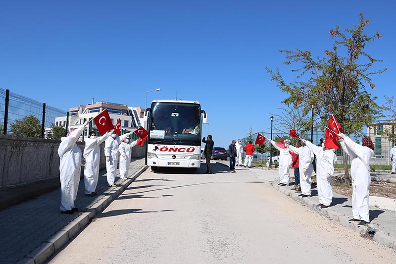 Karantinada yurttan ayrılan vatandaşlara yurt görevlileri ellerinde türk bayrağı ile güle,güle derken Adanalı kafileye’de Adanaya gidekmi şalgamından içekmi türküsünü söylediler Adanalı vatandaşlarda yurt görevlilerine eşlik ettiler.