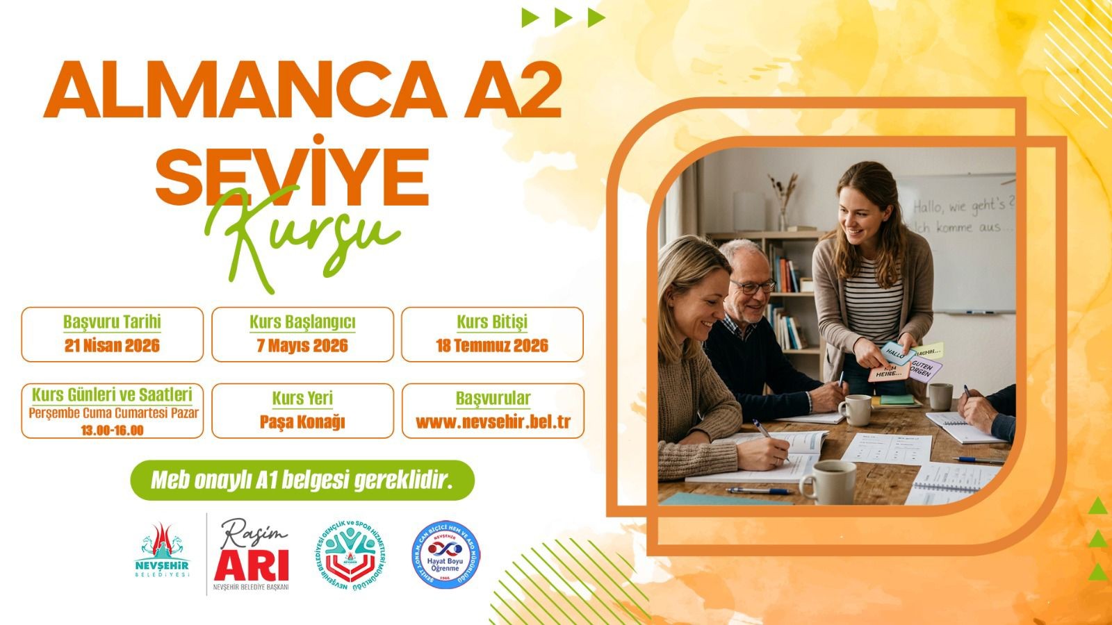 Tarık Kesekçi Parkı içerisindeki Paşa Konağı’nda faaliyet gösteren Nevşehir’in Eğitim Uygarlığı KAPEM yeni kurs döneminde Almanca A1 Seviyesi Kursu; 07 Mayıs 2026 tarihinde başlayıp 02 Temmuz 2026 tarihinde tamamlanacak. Kurs Perşembe, Cuma, Cumartesi ve Pazar günleri 09.00 – 12.00 saatleri arasında yapılacak. Almanca A2 Seviyesi Kursu; 07 Mayıs 2026 tarihinde başlayıp 18 Temmuz 2026 tarihinde tamamlanacak. Kurs Perşembe, Cuma, Cumartesi ve Pazar günleri 13.00 – 16.00 saatleri arasında yapılacak. A2 Kursuna kayıt olabilmek için MEB onaylı A1 sertifikası geçerli olup, kurs sonu başarılı olan kursiyerler MEB onaylı sertifika almaya hak kazanacak.