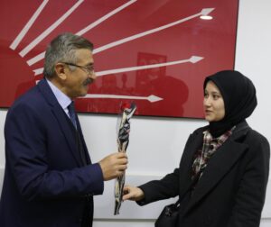 Toplantı öncesinde CHP İl Başkanı Tayfun Ceyhan, Nevşehir’de görev yapan gazeteci genç kıza , 8 Mart Dünya Kadınlar Günü nedeniyle kırmızı karanfil takdim etti.