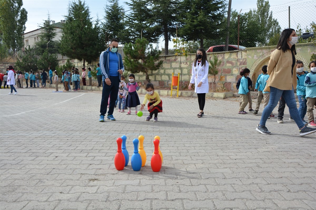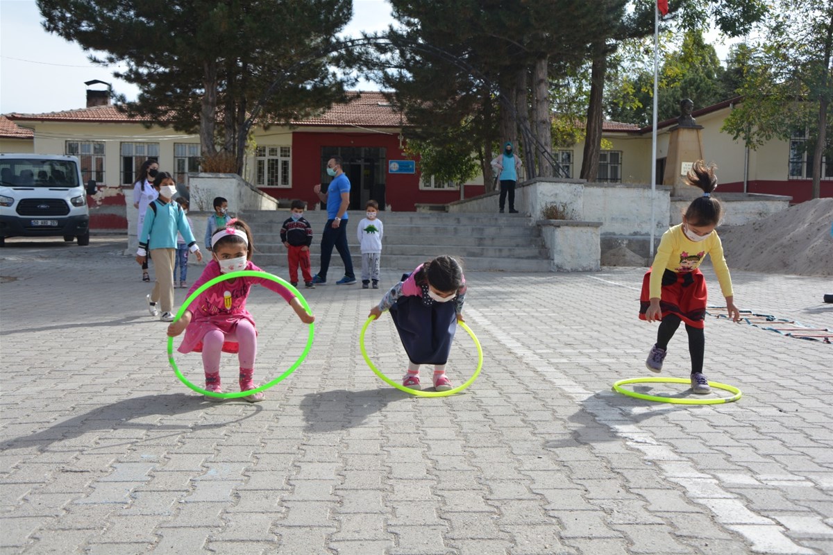 Yüz yüze eğitime başlayan anaokulu ve ilkokul öğrencilerinin gönüllerince eğlenip spor yaptığı etkinlikte miniklerin mutlulukları yüzlerinden okunuyordu.