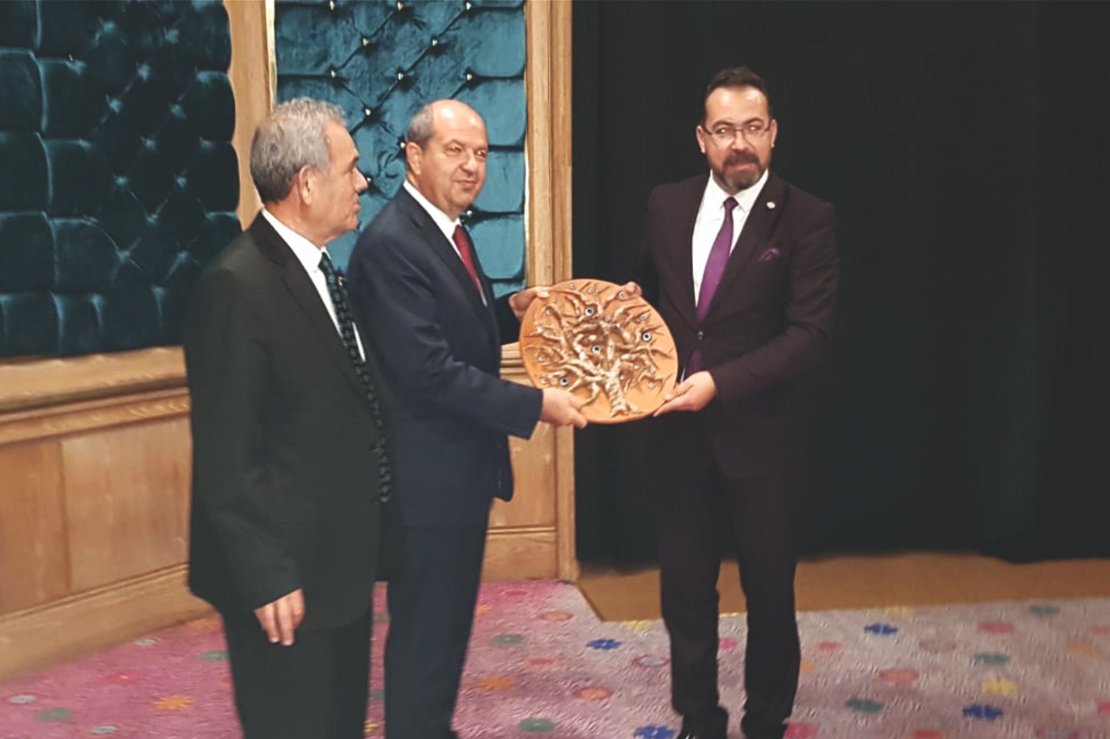 Cumhurbaşkanı Ersin Tatar ile TGF yönetim kurulu akşam yemeğinde bir araya geldi. Yemekte Nevşehir Gazeteciler Cemiyeti Başkanı Bayram Ekici Nevşehir ili adına Cumhurbaşkanı Tatar’a topraktan yapılma Nazar ağacı temalı tabak hediye ederek Kapadokya’ya davet etti. Sıcak bir ortamda yenen akşam yemeği fotoğraf çekimi ile sona erdi.