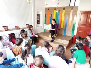 Geziye katılan öğrencilere kütüphane yetkilileri tarafından masal okuma etkinliği yapıldı.