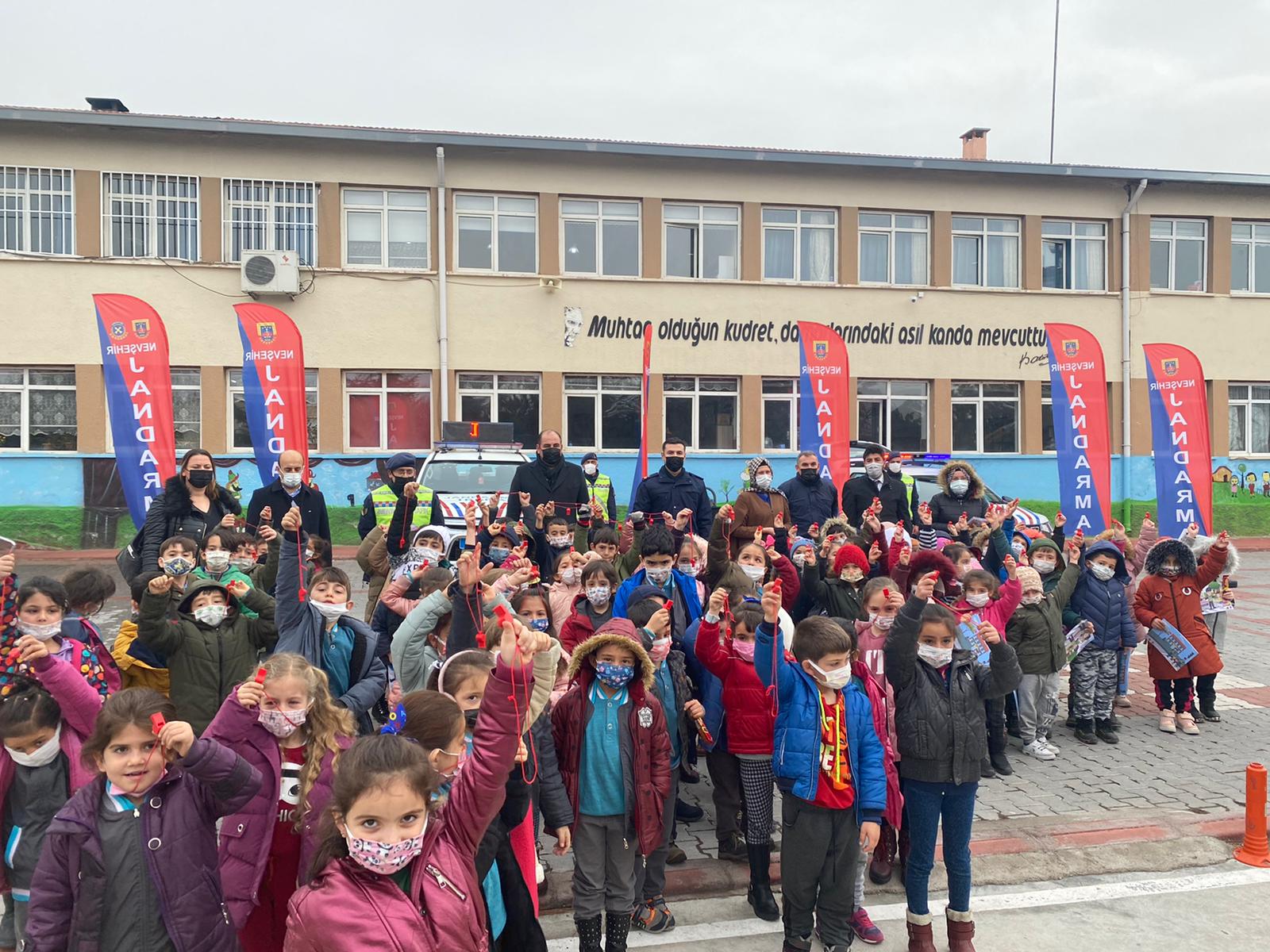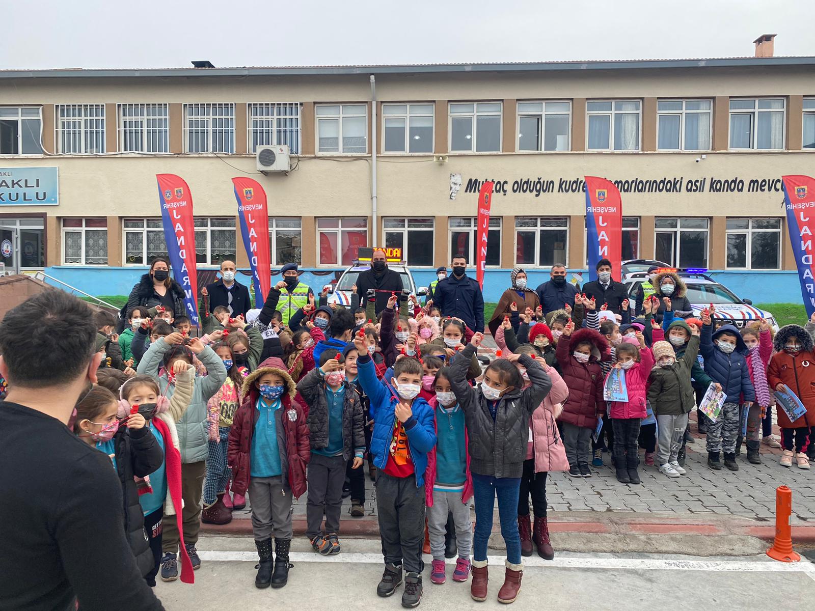 Jandarma ekipleri eğitim sonrasında 1. Sınıf öğrencilerine boyama kitabı ile okul öğrencilerine kırmızı düdük dağıttı.