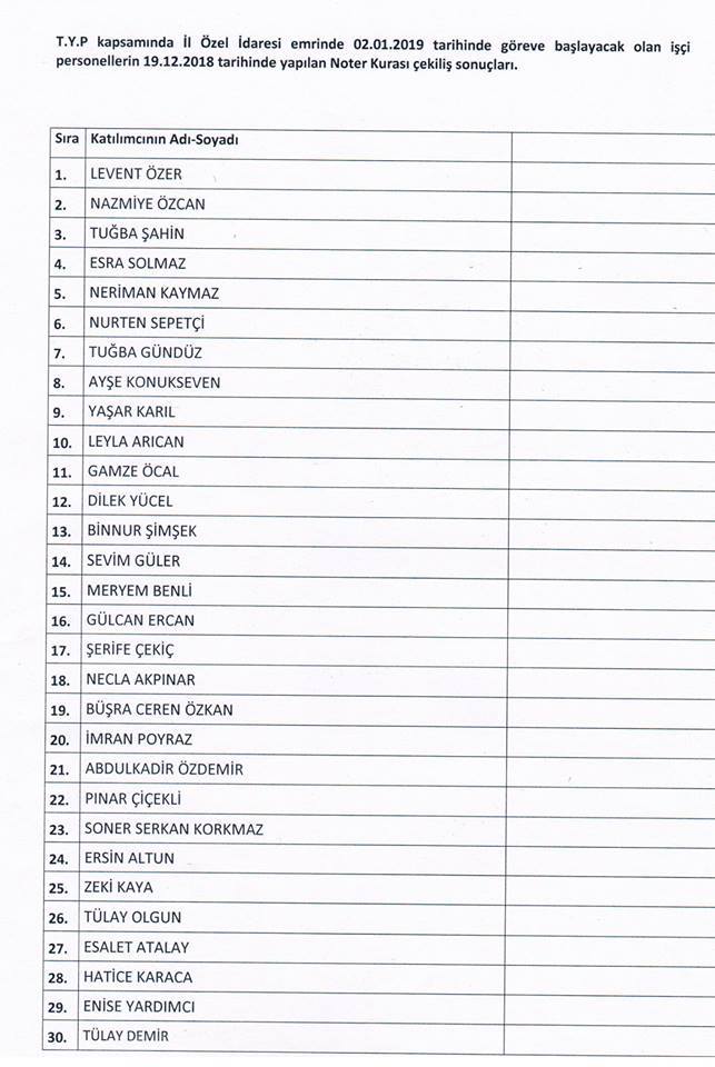 TYP kapsamında İl Özel İdaresi emrinde 02.01.2019 tarihinde göreve başlayacak olan işçi personelin çekilen noter kurası sonuçları açıklandı.