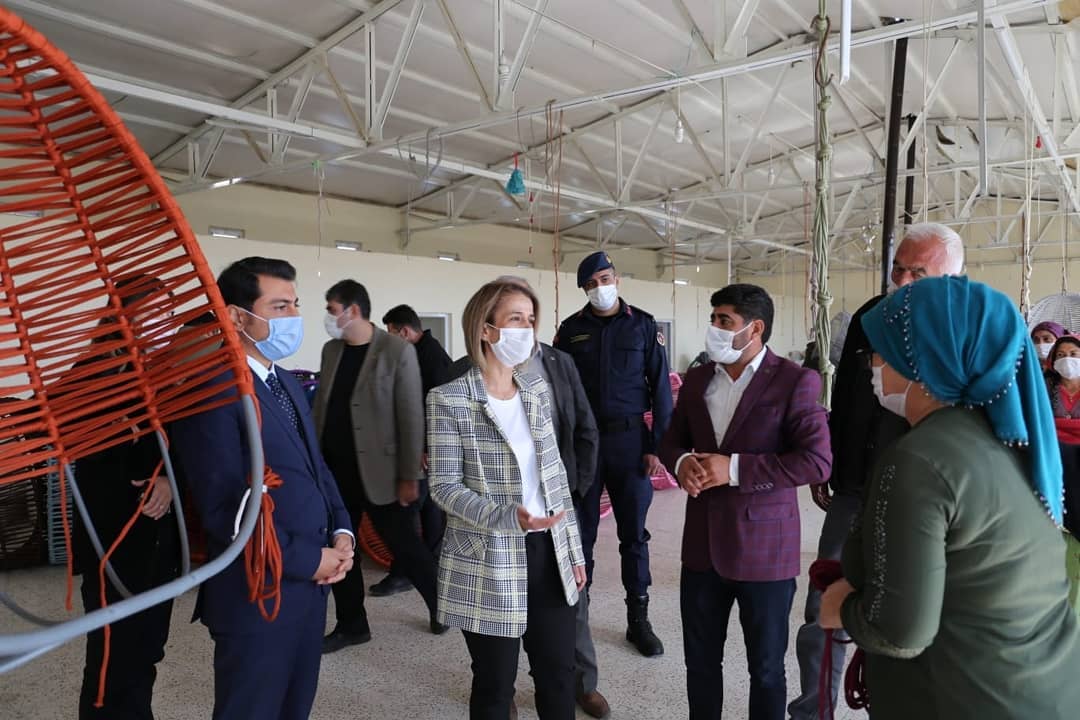 Akarca köyünde kadınların hamak yapımını bir süre izleyen Vali Becel, hamak yapımı ile ilgili olarak çalışan kadınlarla da bir süre sohbet etti.