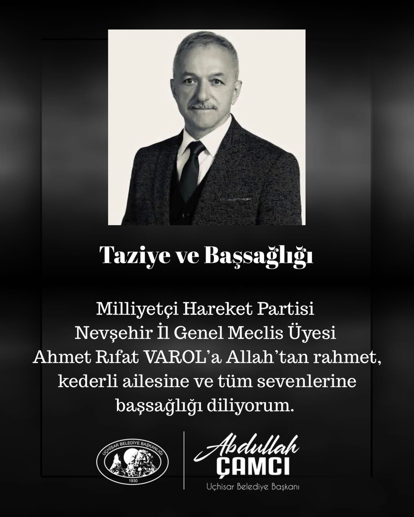 Uçhisar Belediye Başkanı Abdullah Çamcı ,sosyal medya hesapları üzerinden taziye mesajları yayınlayıp, Ahmet Rıfat Varol ‘un ailesi ve sevenlerine taziyelerini ilettiler.