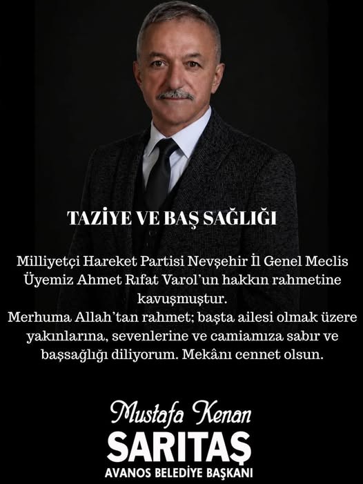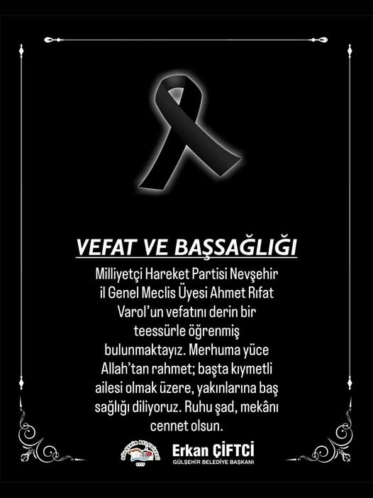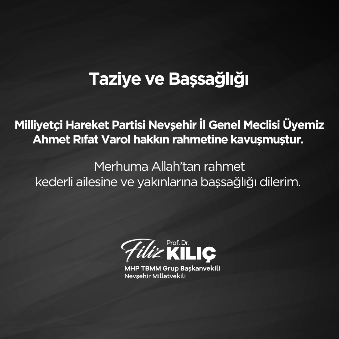 MHP Grup Başkanvekili ve MHP Nevşehir Milletvekili Prof. Dr. Filiz Kılıç’ın taziye mesajı; “ ; Milliyetçi Hareket Partisi Nevşehir İl Genel Meclisi Üyemiz Ahmet Rıfat Varol hakkın rahmetine kavuşmuştur. Merhuma Allah’tan rahmet kederli ailesine ve yakınlarına başsağlığı dilerim.”