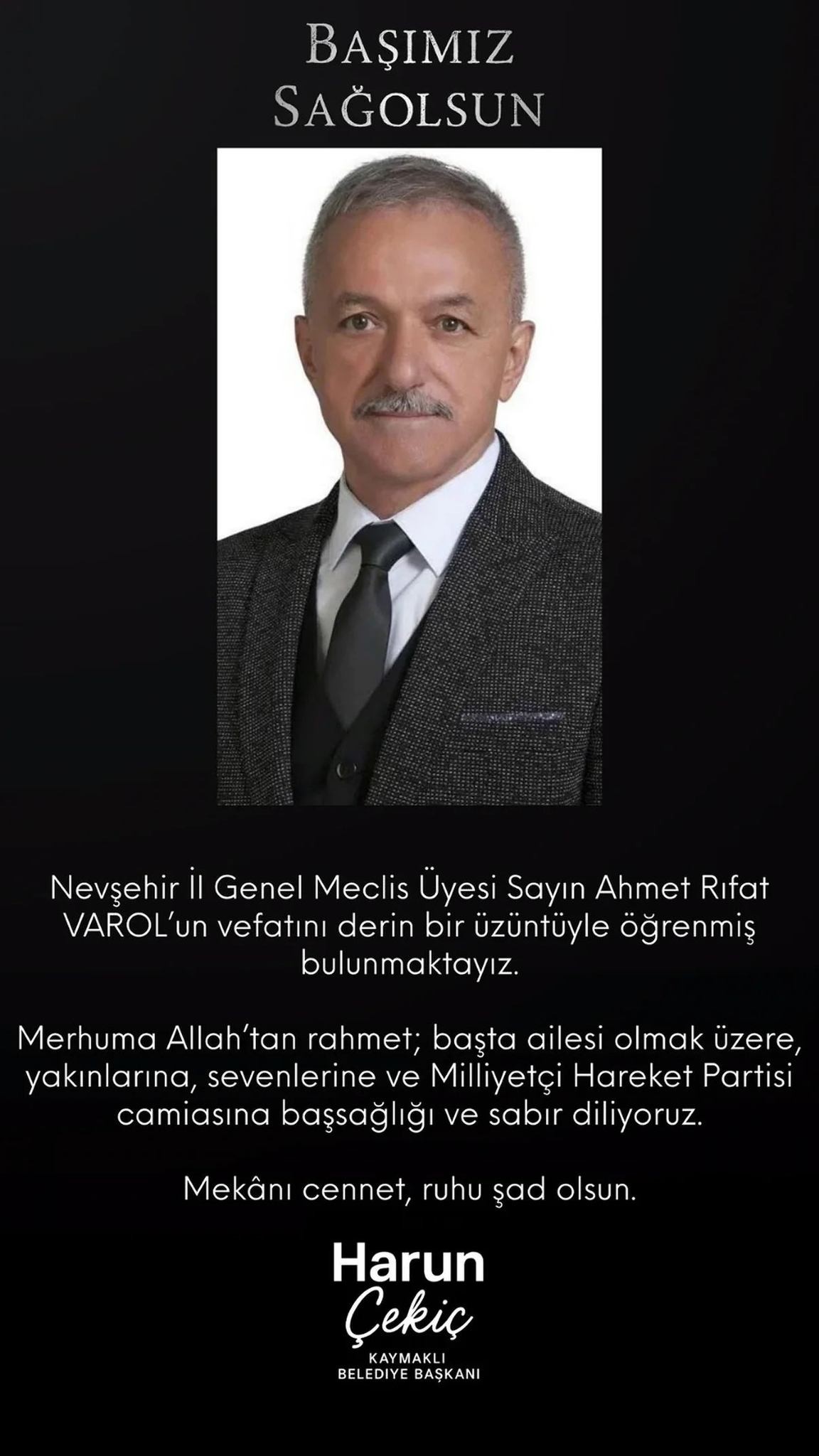 MHP İl Başkanı Adnan Doğu’nun taziye mesajı: ‘Abimiz Büyüğümüz Ülkücü Camiada ve Bizlerde çok Emekleri olan MHP İl Genel Meclis Üyemiz Ahmet Rıfat VAROL Abimizi kaybettik Allahım Rahmet Eylesin Mekanı Cennet Olsun. Ailesine ve yakınlarına Sabırlar diliyorum. Başımız Sağ olsun.”