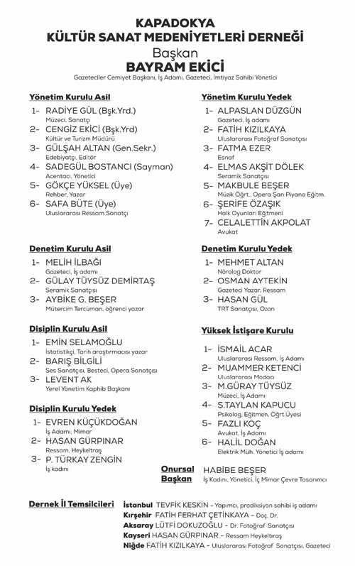 Kapadokya Kültür Sanat Medeniyetleri Derneğinin 1. Olağan genel kurulu 28 Aralık 2017 Perşembe günü Avanos Güray Müze’de yapıldı.Nevşehir’den ve farklı şehirlerden gelen sanatçı, yazar, tarihçiler ve üyeleri n katılımıyla gerçekleşen genel kurulda, Kapadokya Kültür Sanat Medeniyetleri Derneği’ne Nevşehir Gazeteciler Cemiyeti Başkanı da olan Bayram Ekici Başkan olarak seçildi.