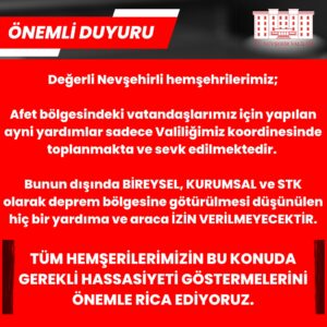 NEVŞEHİR(TREND HABER)-Nevşehir Valiliğinin deprem bölgelerinde yoğunlukla ihtiyaç duyulan vatandaşlarımızdan yoğun bir şekilde gelen kendi araçları ile malzeme götürme talebi üzerine Nevşehir Valiliği sosyal medya hesabı üzerinden yapılan açıklamada vatandaşlarımızdan yoğun bir şekilde gelen kendi araçları ile malzeme götürme talebi üzerine yapıldı. Çok duyarlı bir milletimiz var Allah razı olsun. Fakat bireysel gitmek o bölgede kargaşaya ve trafik yoğunluğuna sebep olacak ve gidenler hiç bir koordinasyon olmadan gideceği için iyilikten çok zorluk olacak.