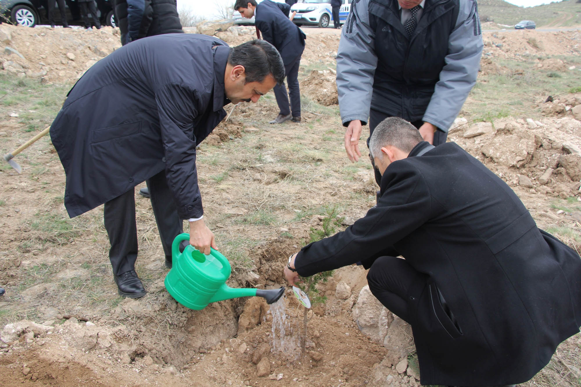 Vali Aktaş ve katılımcılar 5.500 m2 alan üzerinde oluşturulan alanda fidanları toprakla buluşturarak can suyu verdi.